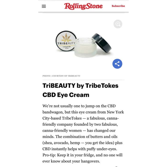 We’re not usually one to jump on the CBD bandwagon, but this eye cream from New York City-based TribeTokes — a fabulous, canna-friendly company founded by two fabulous, canna-friendly women — has changed our minds. The combination of butters and oils (shea, avocado, hemp — you get the idea) plus CBD instantly helps with puffy under-eyes. Pro-tip: Keep it in your fridge, and no one will ever know about your hangovers.”