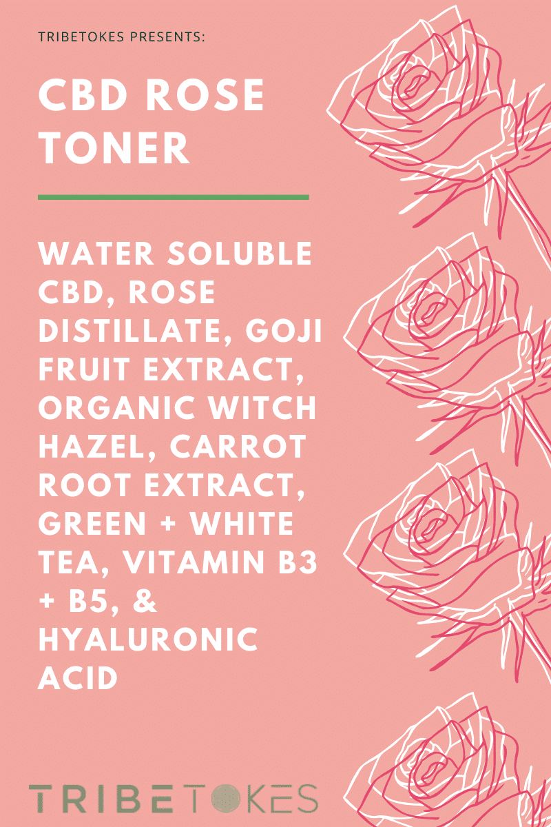 Hemp-derived Cannabidiol, Organic Rose Distillate, Organic Green + White Tea, Organic Witch Hazel, Niacinamide (Vitamin B3), Rose Ether, Carrot Root Extract, Panthenol (Vitamin B5), Allantoin (from Comfrey), Hyaluronic Acid, Organic Goji Fruit Extract.