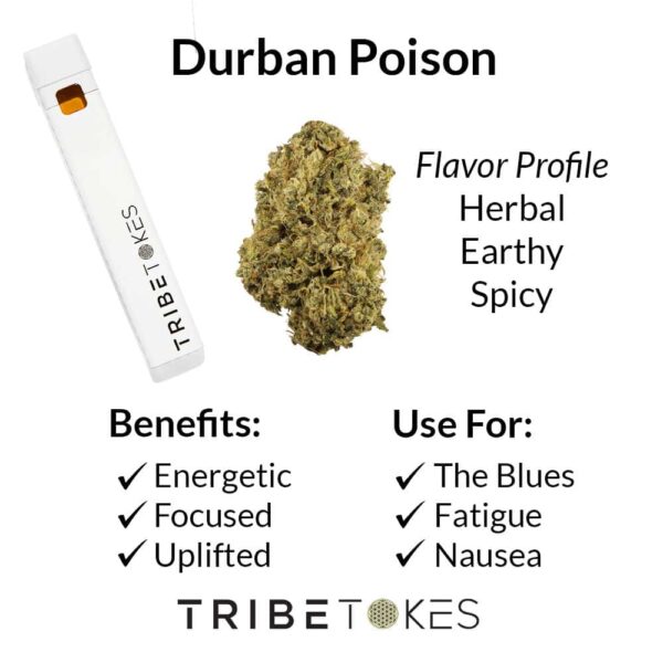 TribeTokes Durban Poison vape oils use the terpenes and flavonoids extracted from the Durban Poison flower strain to recreate its effects in oil form.