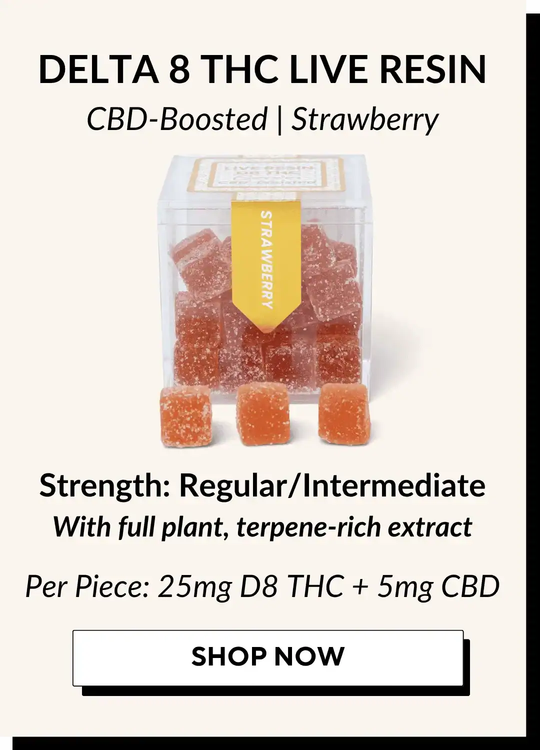 Delta 8 and Delta 9: We recommend starting with 1/4 – 1/2 of a gummy to see how you feel before consuming more. This may be all you need! It can take 30-120 minutes for the effects of live resin edibles to be felt, so always consume responsibly and with patience.