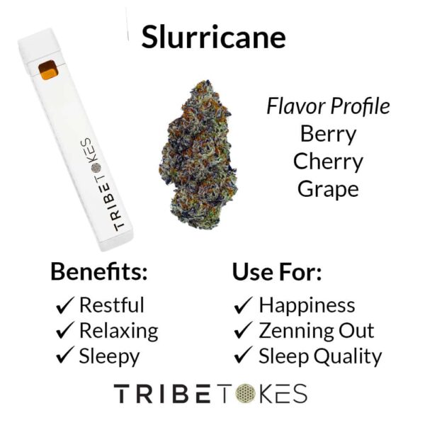 The Scoop: Slurricane is an indica strain made by crossing Do-Si-Dos with Purple Punch. Slurricane is very relaxing, sometimes known to cause couch lock or put you right to sleep. With a sweet and sugary, berry flavor profile, this tasty strain is great for relaxing after a long day.